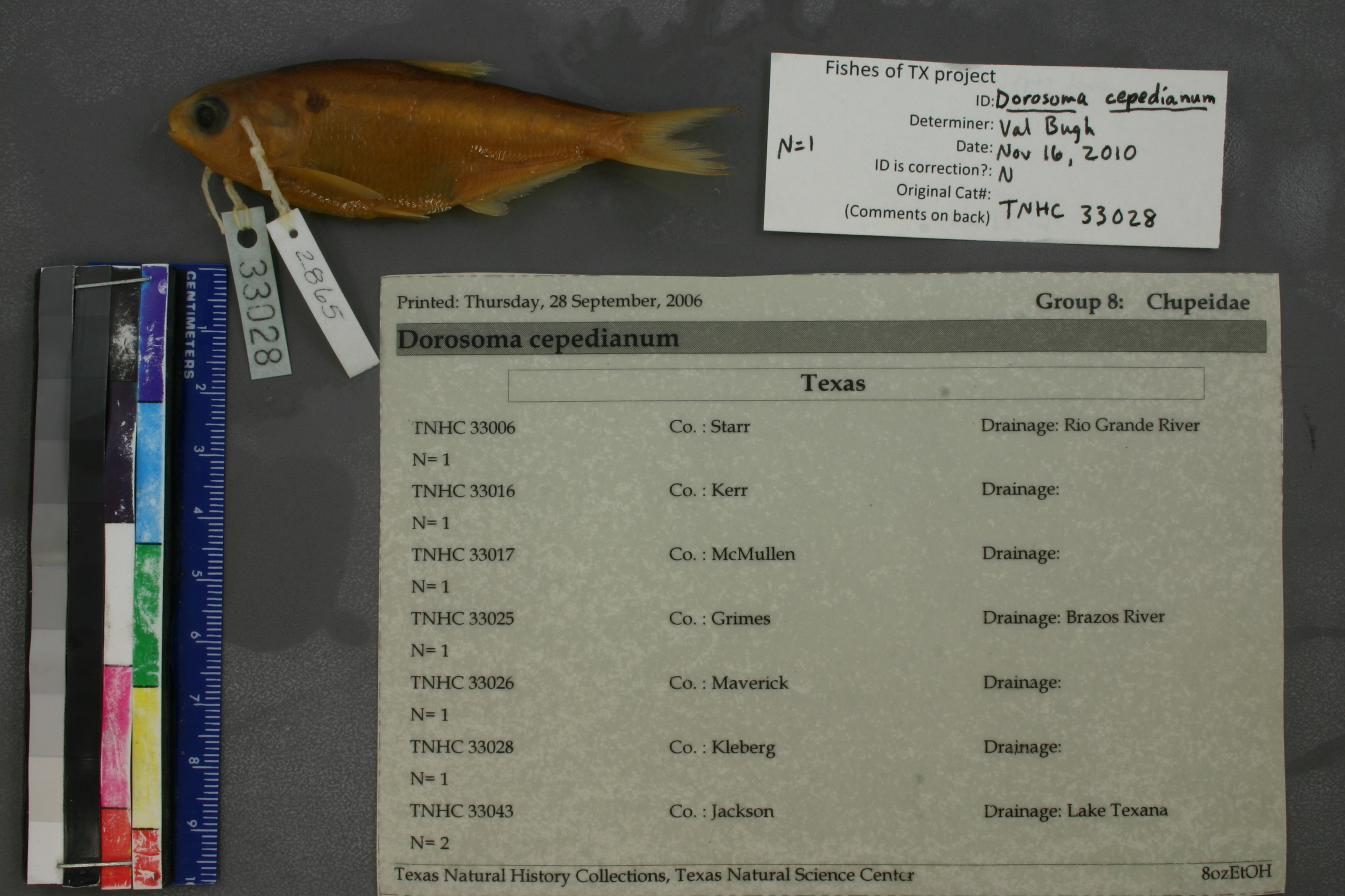 Specimen examined and Id'ed for FoTX project. | ID notes: anal rays: 34; MinSL(mm): 71; MaxSL(mm): ; Jar: 8 oz; Specimen condition: good; Mutations: none; Count Male: ; Count female: ; Extern parasites: