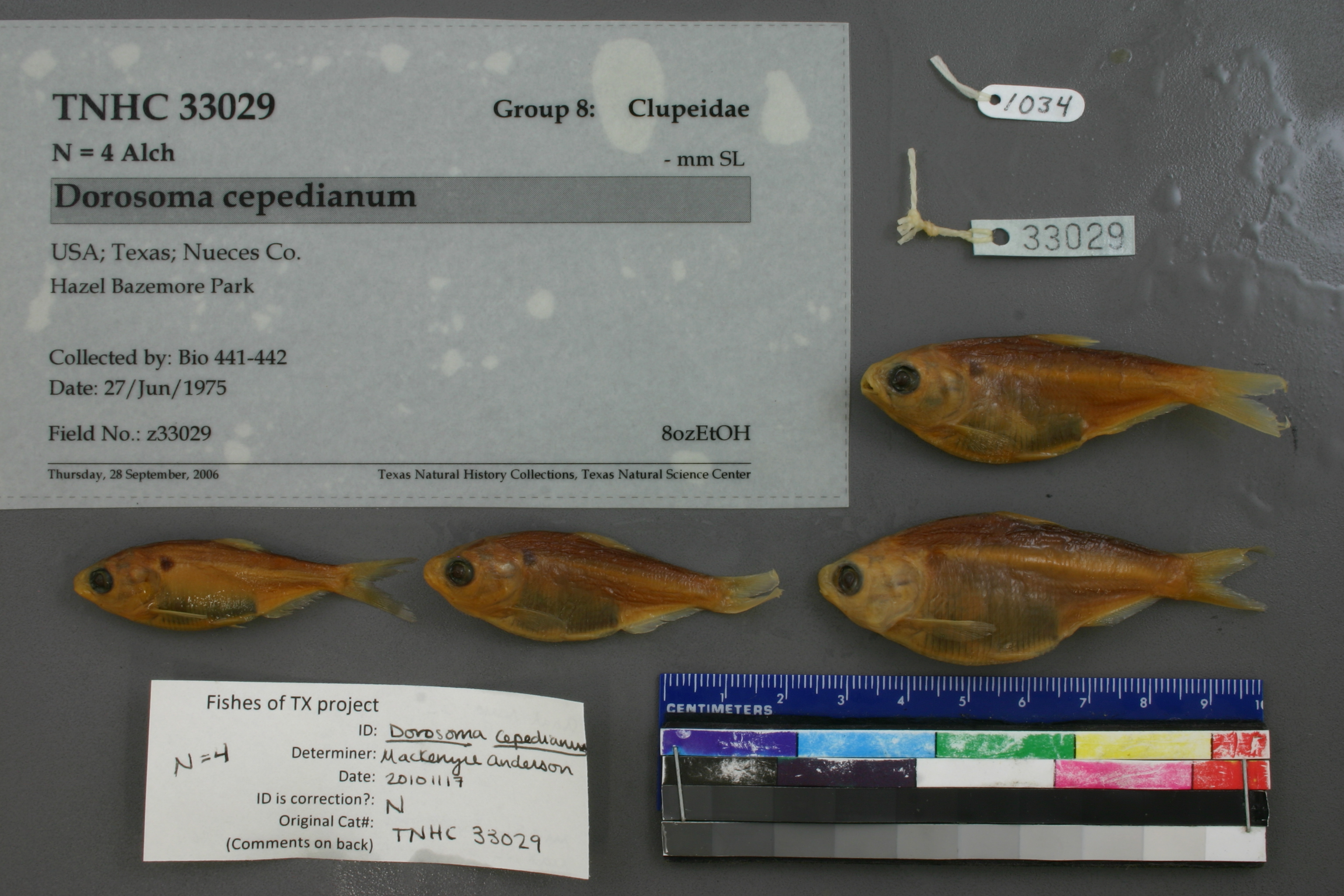 Specimen examined and Id'ed for FoTX project. | ID notes: anal rays: 32; MinSL(mm): 43.83; MaxSL(mm): 61.07; Jar: 8 oz; Specimen condition: good; Mutations: none; Count Male: ; Count female: ; Extern parasites: