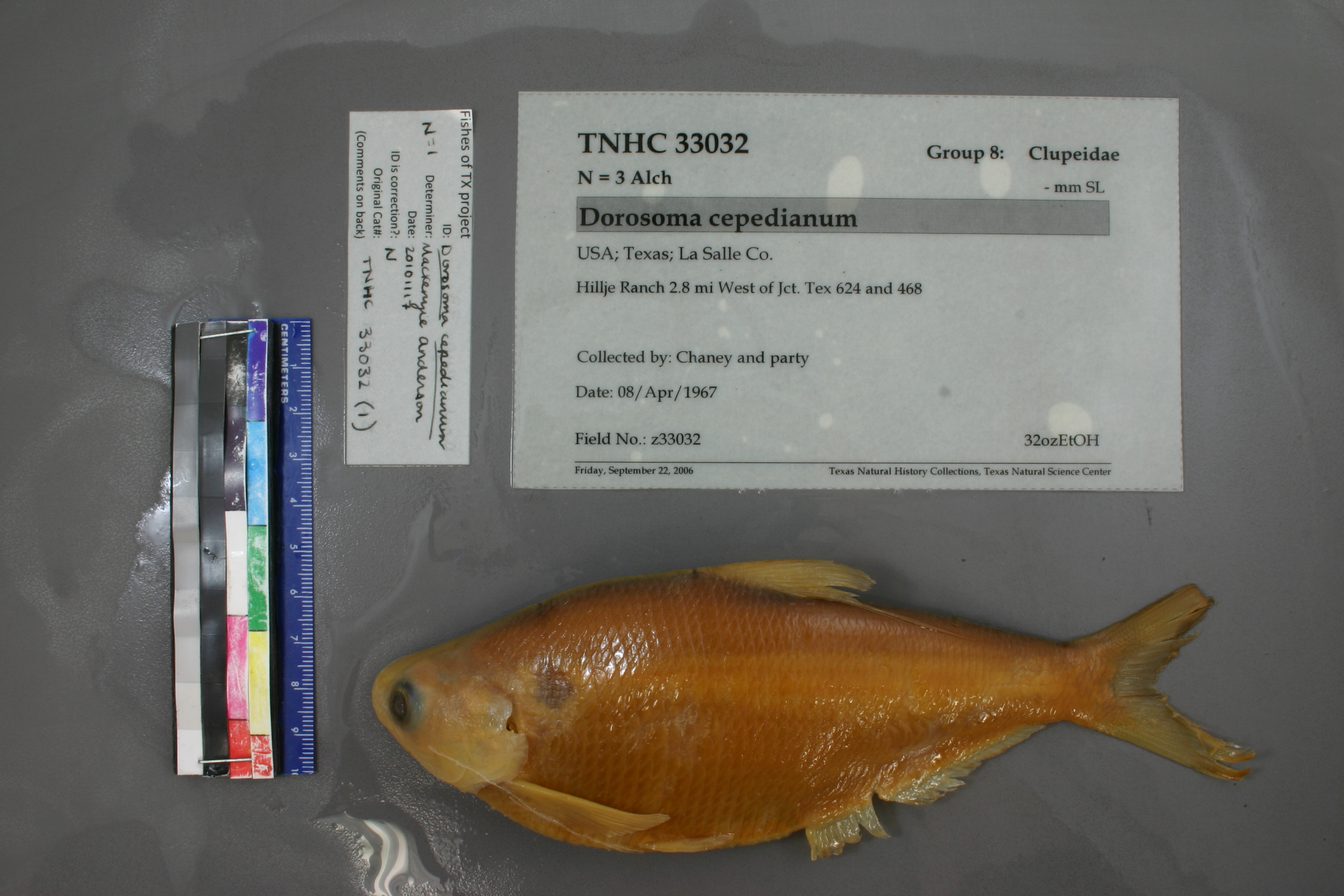 Specimen examined and Id'ed for FoTX project. | ID notes: anal rays: 33; MinSL(mm): 150.14; MaxSL(mm): ; Jar: quart; Specimen condition: good; Mutations: none; Count Male: ; Count female: ; Extern parasites: