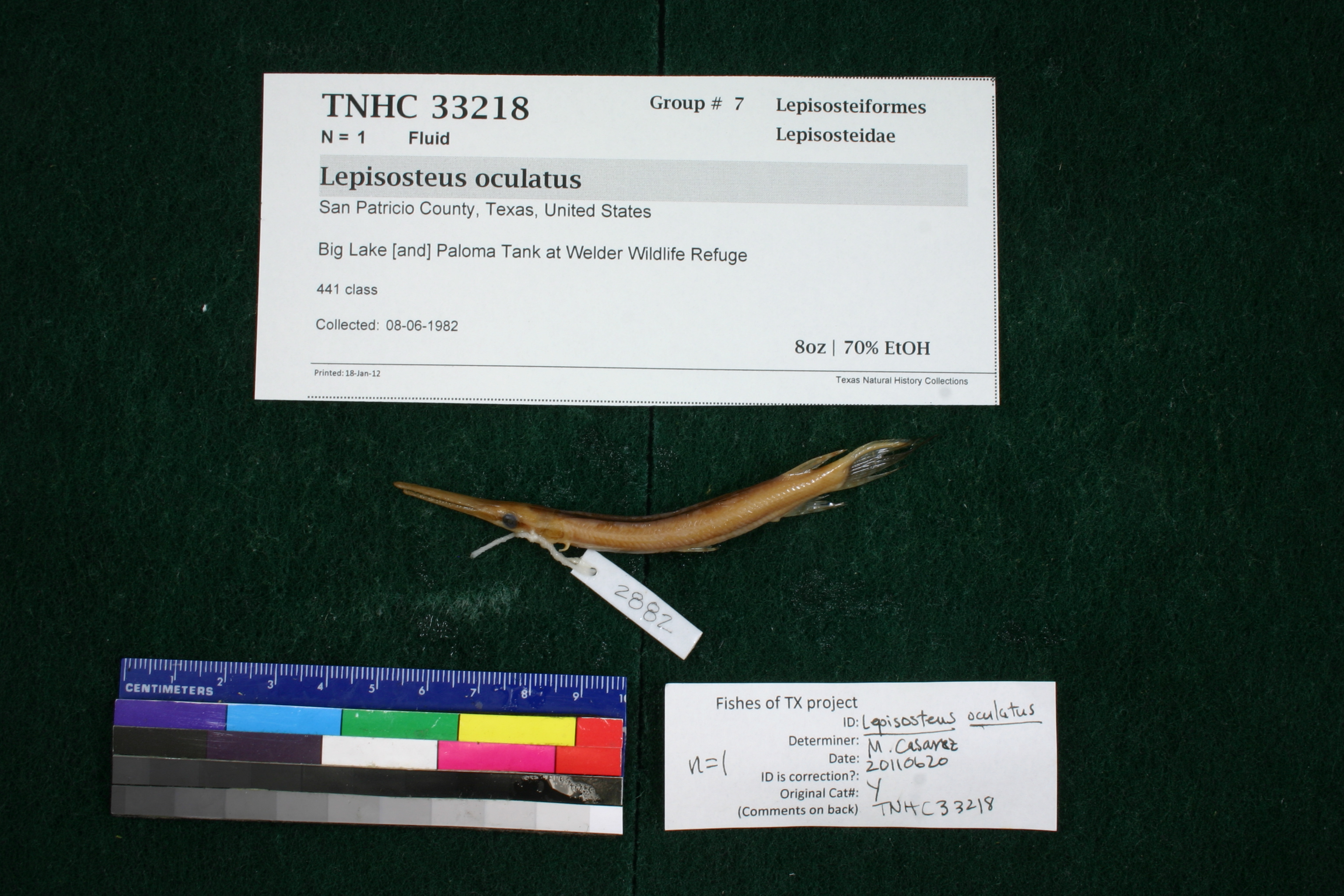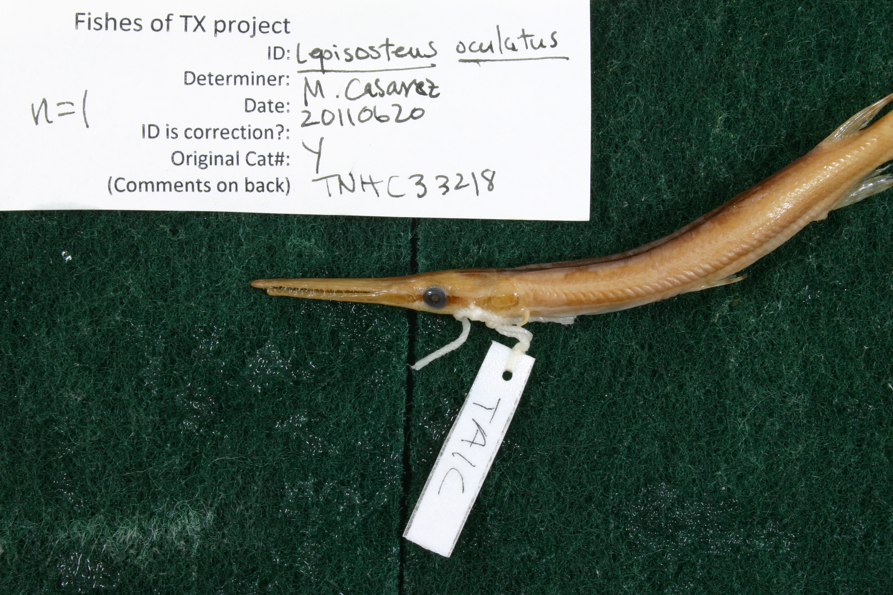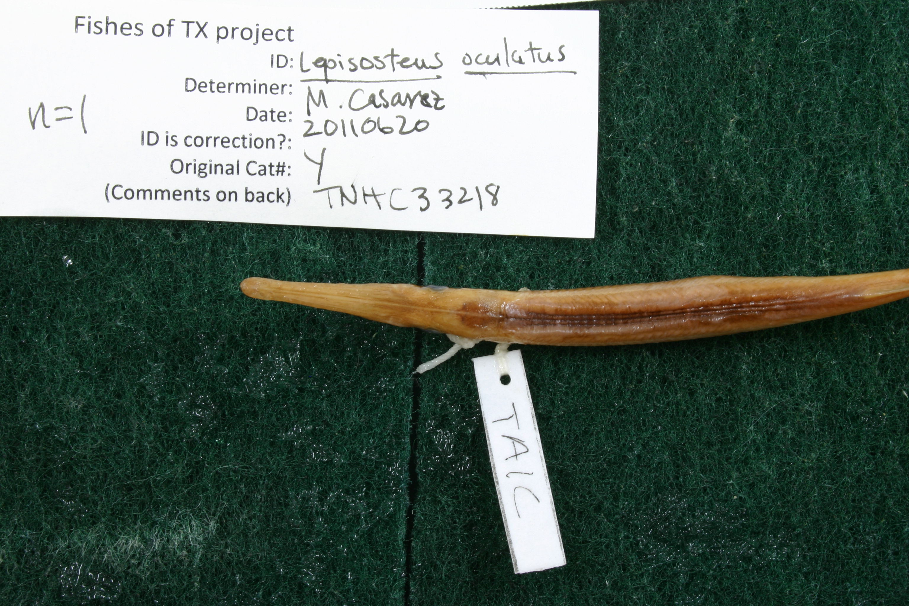 Specimen examined and Id'ed for FoTX project. | ID notes: lateral line scales: 54-55; *note for SL measurements that gar have heterocercal tails - all length measurements are based on SL and are approximate; MinSL(mm): 91.09; MaxSL(mm): ; Jar: 8 oz; Specimen condition: good; Mutations: none; Count Male: ; Count female: ; Extern parasites: n