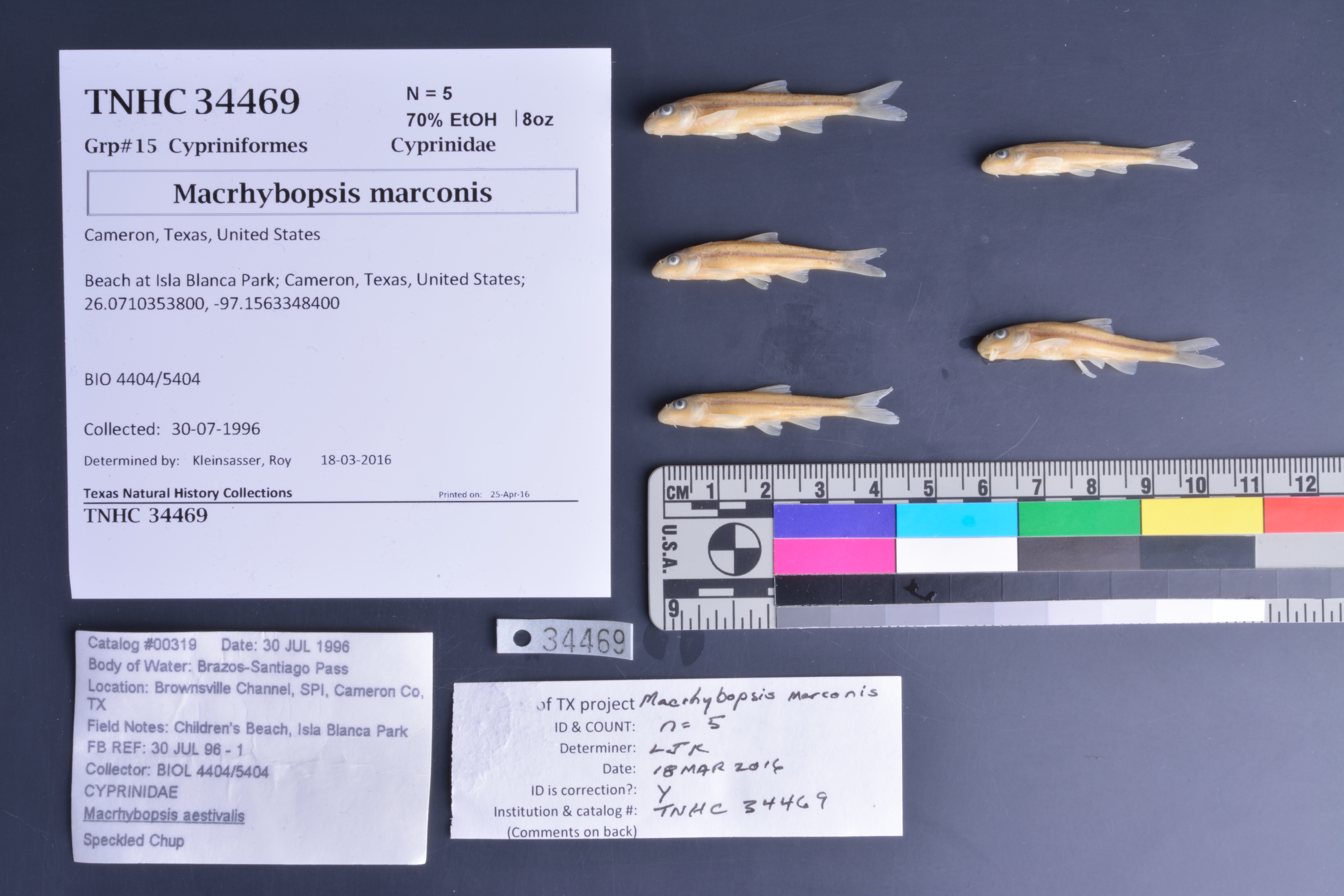 ID complete | Locality a problem, listed as South Padre Island; unlikely; also basin (RG) does not match species. Other species caught at site ensure collection are marine.