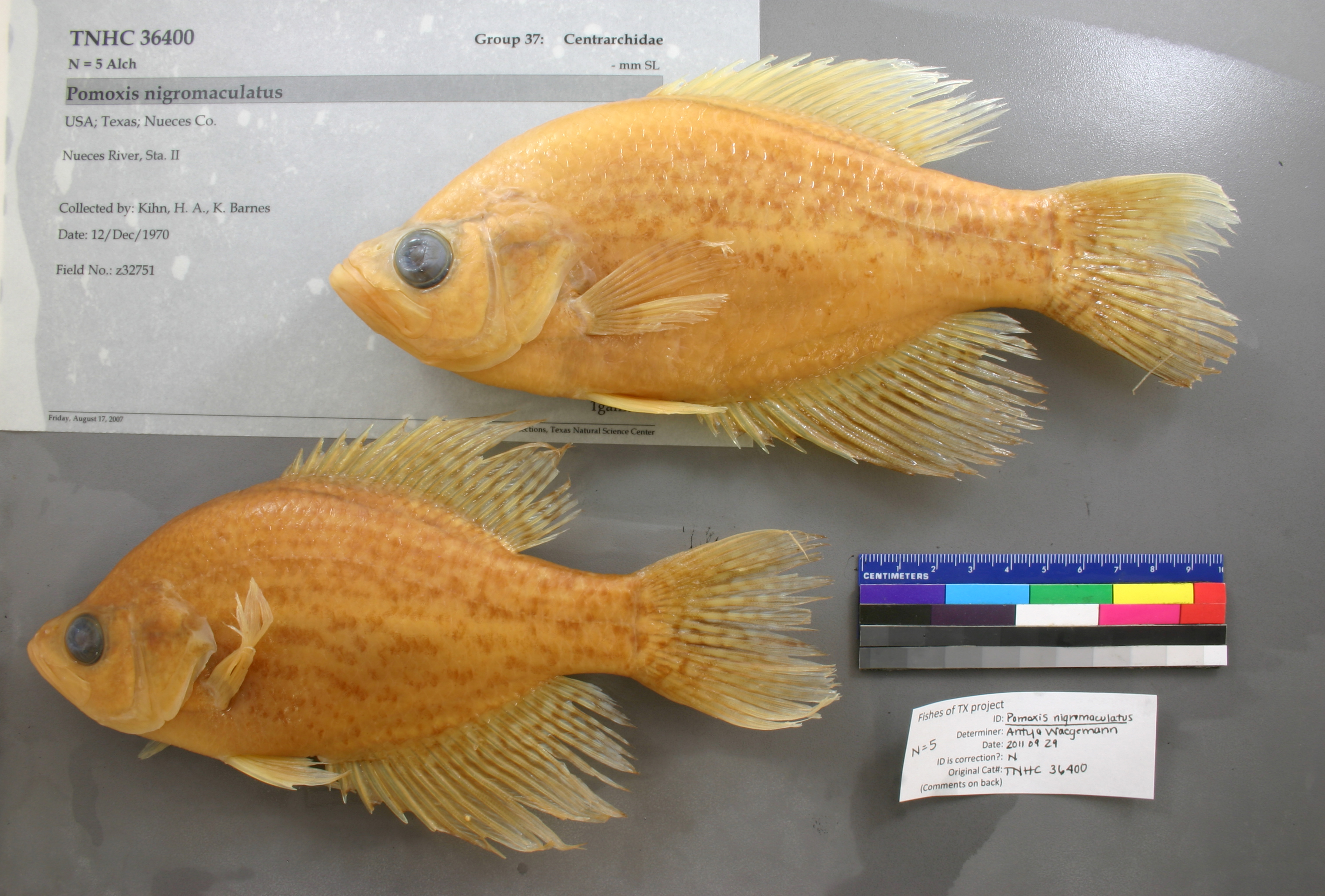 Specimen examined and Id'ed for FoTX project. | ID notes: dorsal spines: 7,8; MinSL(mm): 162.61; MaxSL(mm): 182.49; Jar: 1 gallon; Specimen condition: good; Mutations: none; Count Male: ; Count female: ; Extern parasites: y
