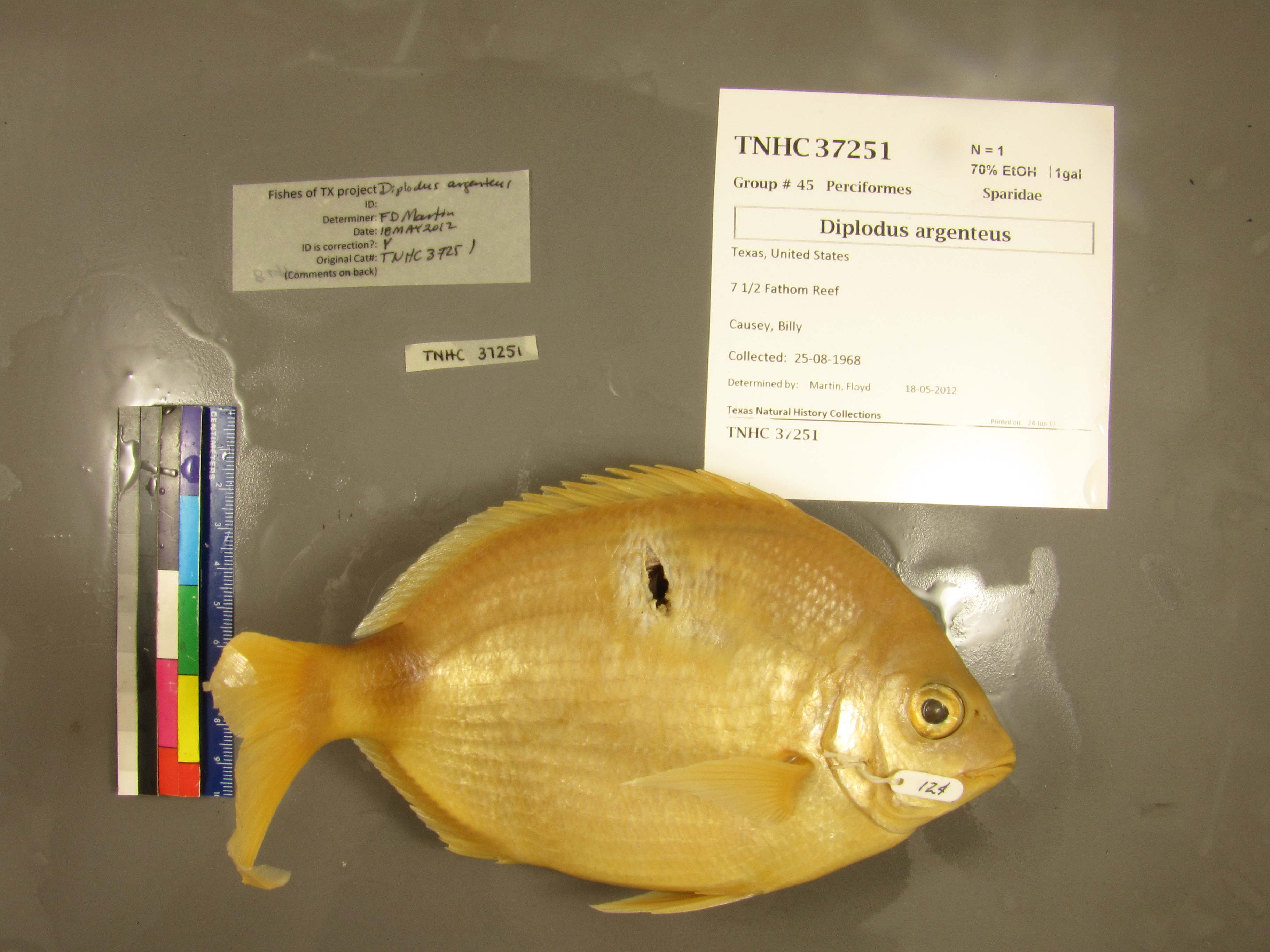 Specimen examined and Id'ed for FoTX project. | ID notes: 8 upper incisors; MinSL(mm): 152; MaxSL(mm): ; Jar: gallon; Specimen condition: good; Mutations: none; Count Male: ; Count female: ; Extern parasites: n