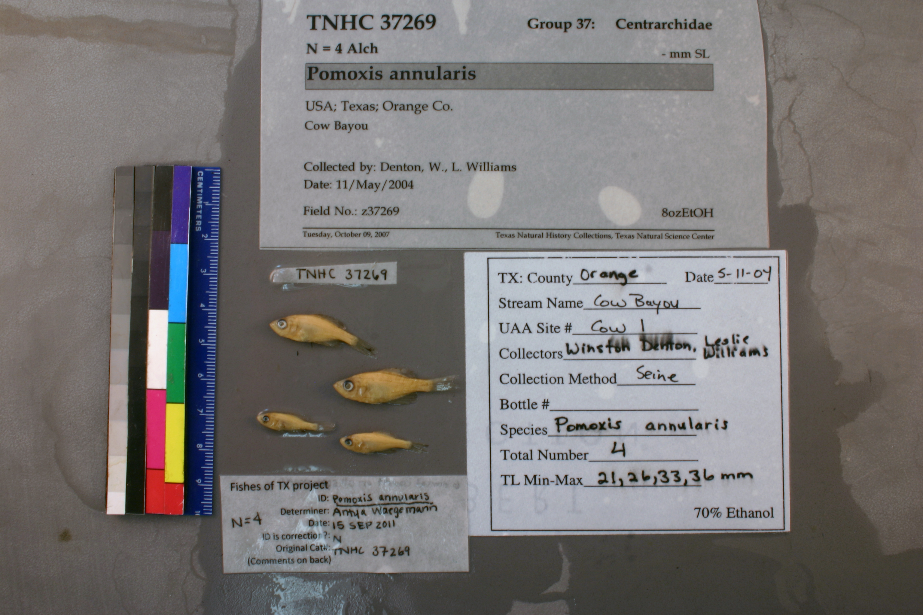 Specimen examined and Id'ed for FoTX project. | ID notes: dorsal spines: 6; MinSL(mm): 15.91; MaxSL(mm): 26.36; Jar: 8 oz; Specimen condition: good; Mutations: none; Count Male: ; Count female: ; Extern parasites: n