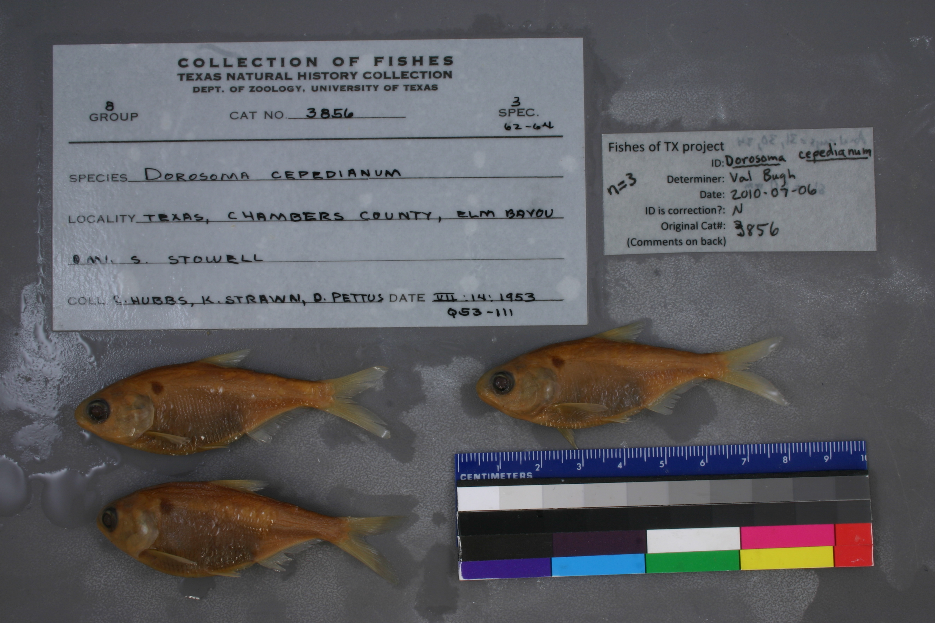 Specimen examined and Id'ed for FoTX project. | ID notes: anal rays > 30 ; MinSL(mm): 60; MaxSL(mm): ; Jar: 8 oz; Specimen condition: good; Mutations: none; Count Male: ; Count female: ; Extern parasites: n