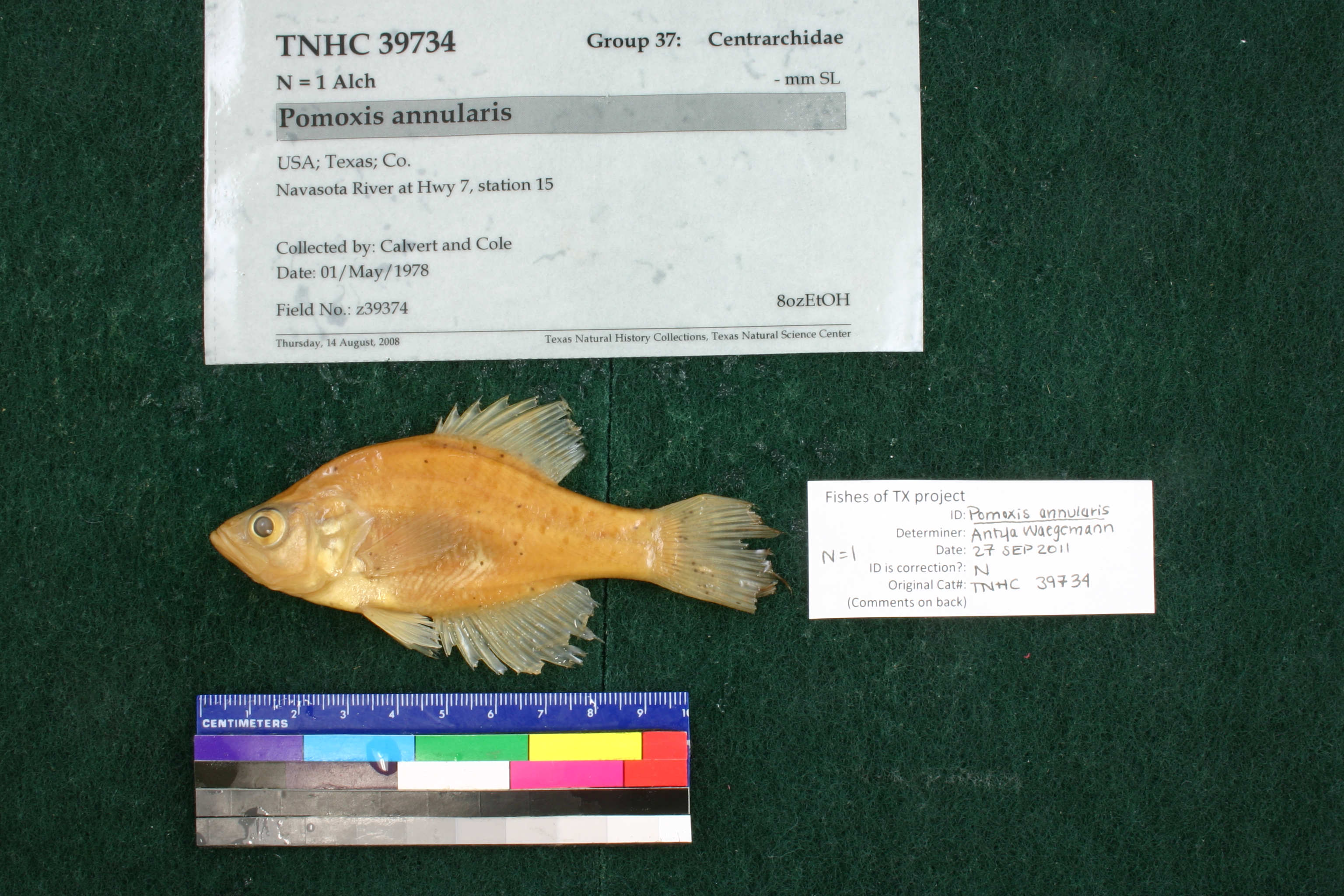 Specimen examined and Id'ed for FoTX project. | ID notes: dorsal spines: 6; parasites present; MinSL(mm): 87.22; MaxSL(mm): ; Jar: 8 oz; Specimen condition: good; Mutations: none; Count Male: ; Count female: ; Extern parasites: y