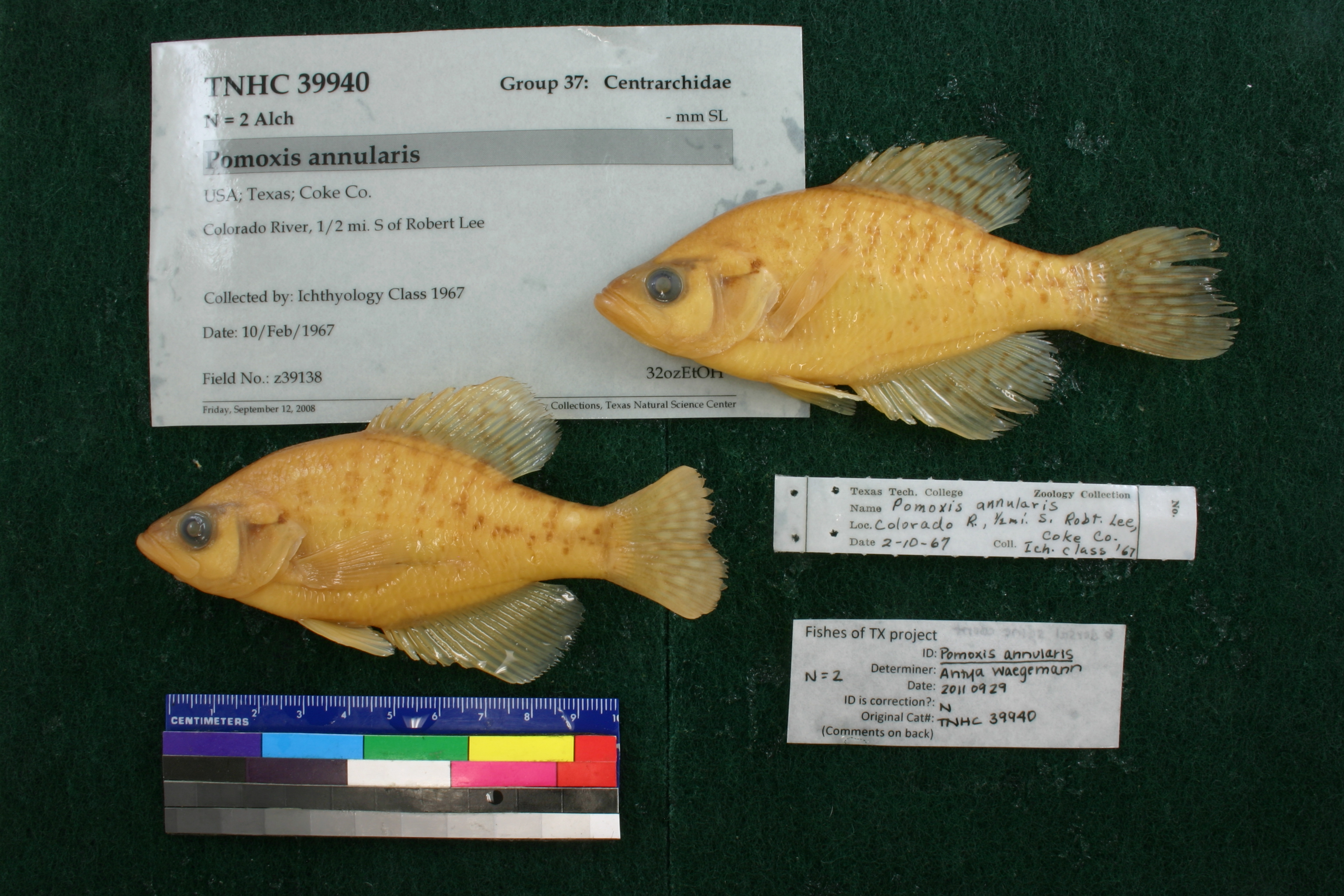 Specimen examined and Id'ed for FoTX project. | ID notes: dorsal spines: 6; MinSL(mm): 99.4; MaxSL(mm): 102.89; Jar: 32 oz; Specimen condition: good; Mutations: none; Count Male: ; Count female: ; Extern parasites: n