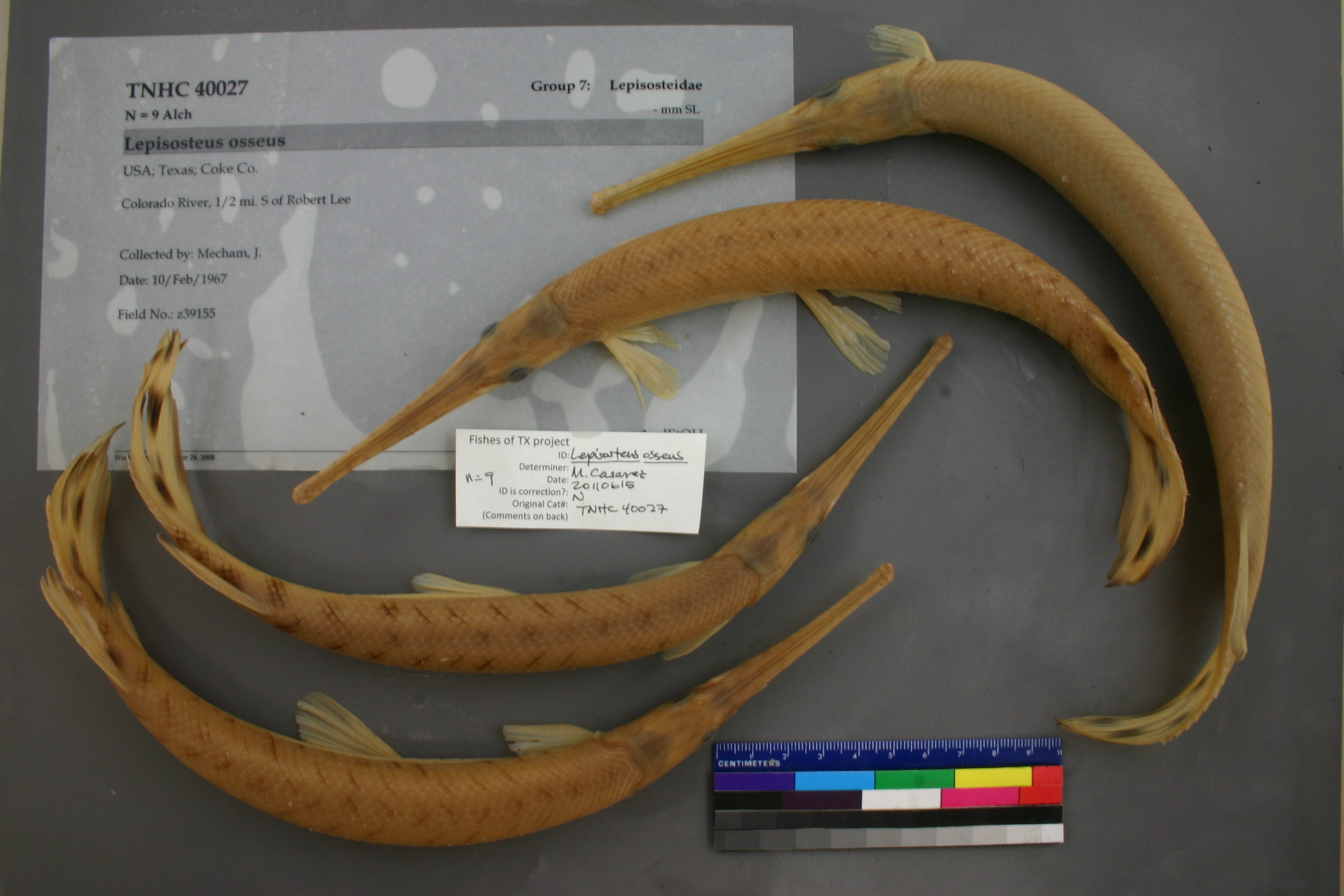 Specimen examined and Id'ed for FoTX project. | ID notes: lateral line scales: 62,63; *note for SL measurements that gar have heterocercal tails - all length measurements are based on SL and are approximate; MinSL(mm): 244; MaxSL(mm): 311; Jar: 1 gallon; Specimen condition: good; Mutations: none; Count Male: ; Count female: ; Extern parasites: n