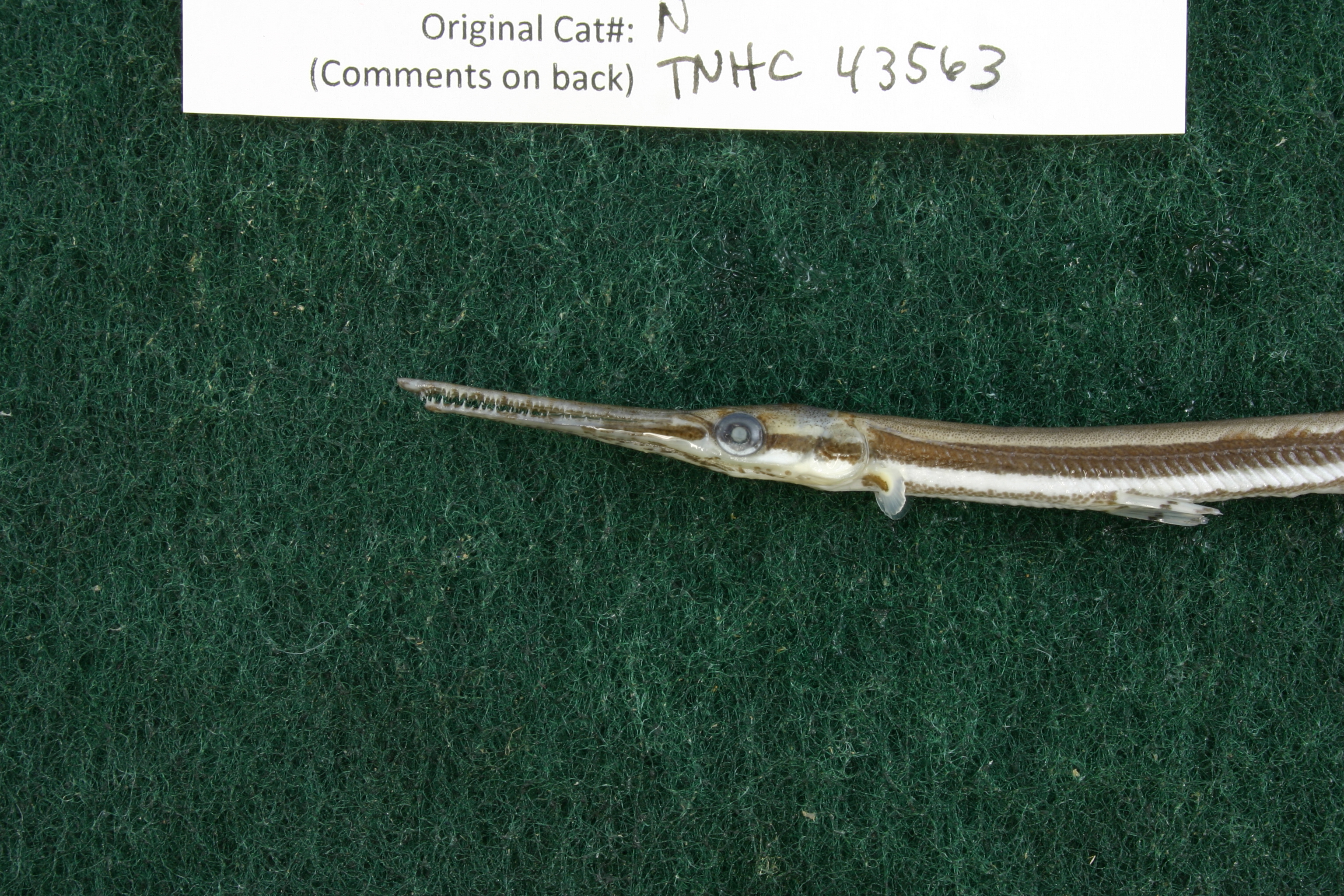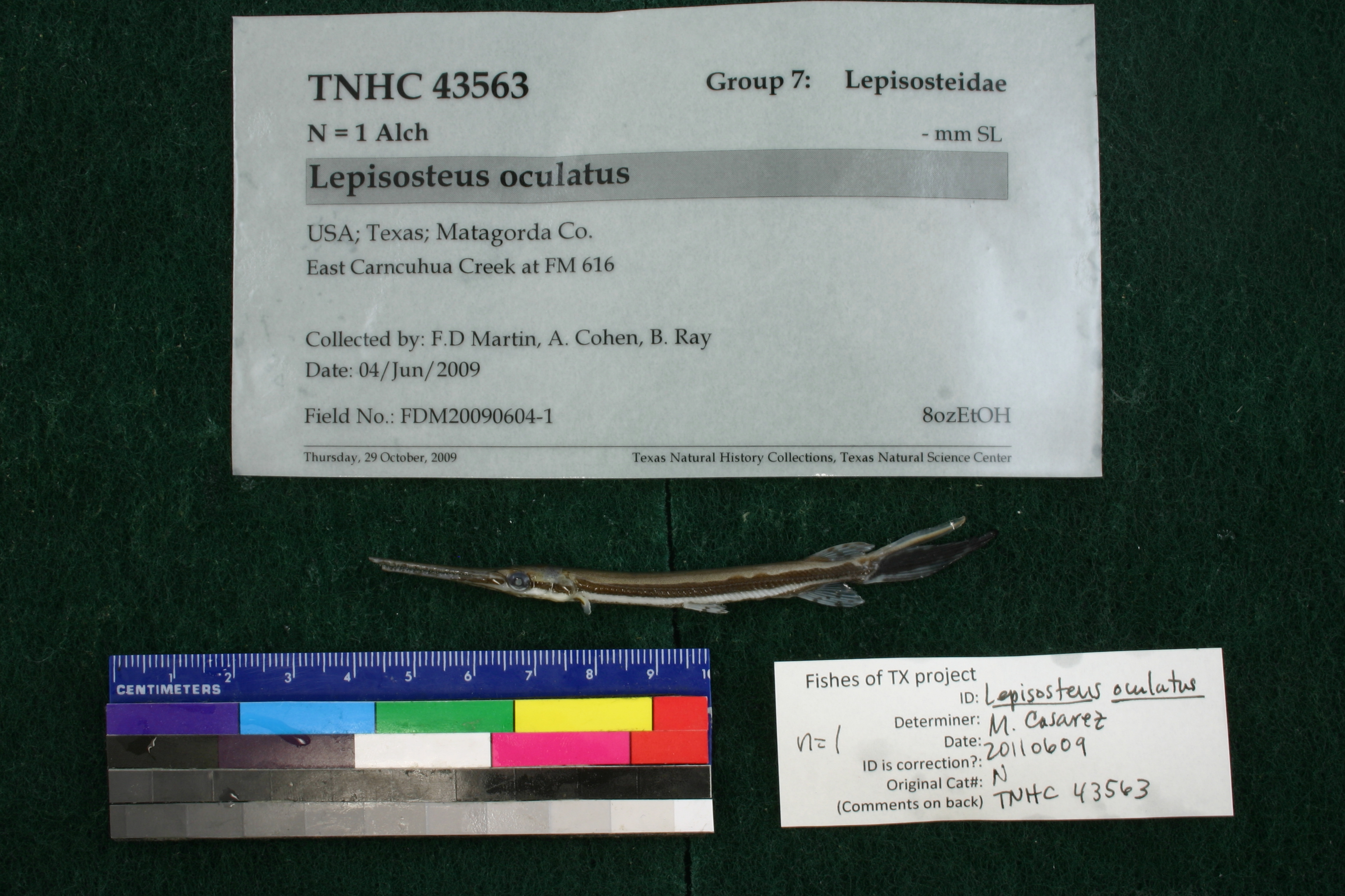 Specimen examined and Id'ed for FoTX project. | ID notes: lateral line scales: 56; *note for SL measurements that gar have heterocercal tails - all length measurements are based on SL and are approximate; MinSL(mm): 82.24; MaxSL(mm): ; Jar: 8 oz; Specimen condition: good; Mutations: none; Count Male: ; Count female: ; Extern parasites: n