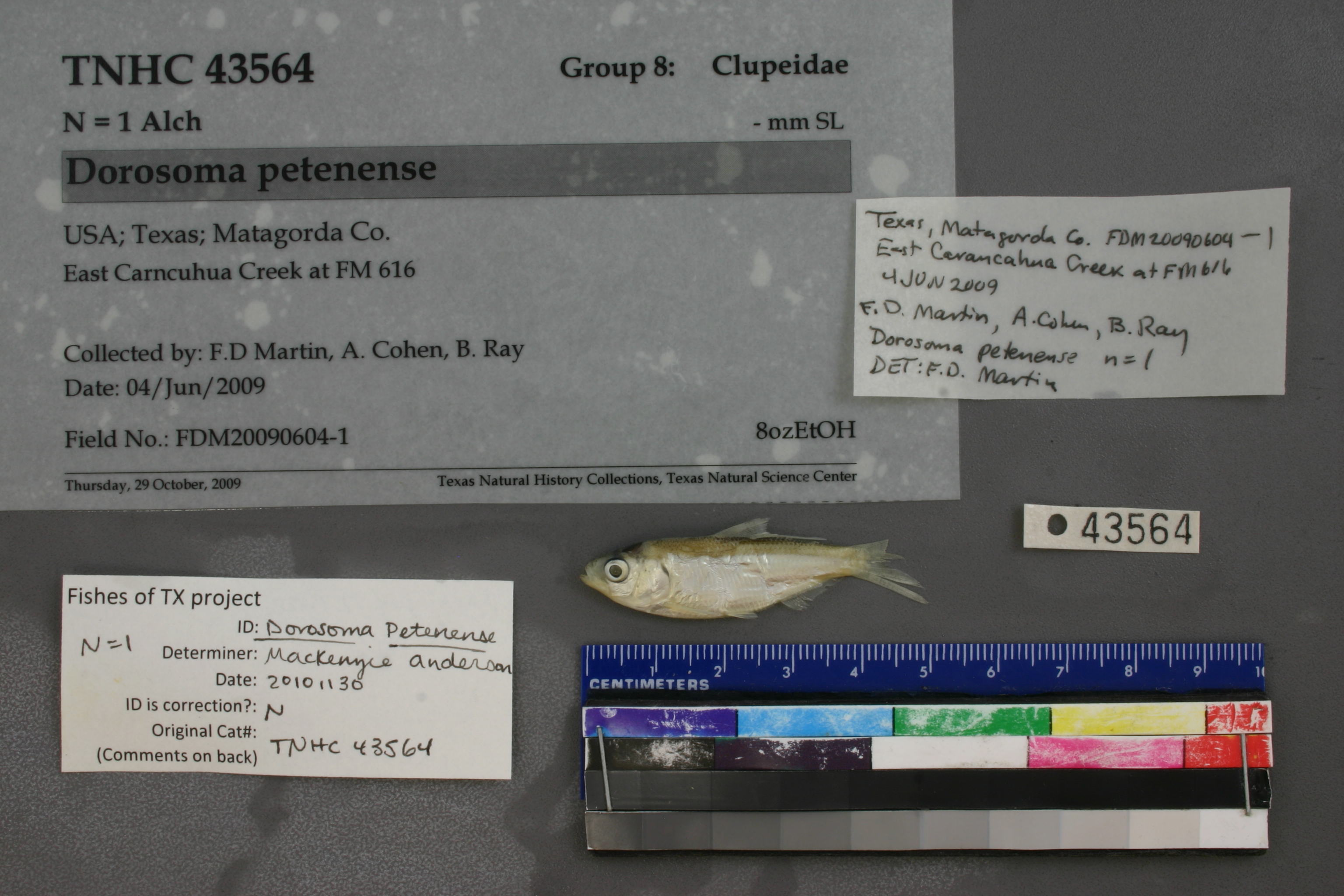 Specimen examined and Id'ed for FoTX project. | ID notes: anal rays: 27-28; MinSL(mm): 40.16; MaxSL(mm): ; Jar: 8 oz; Specimen condition: good; Mutations: none; Count Male: ; Count female: ; Extern parasites: n