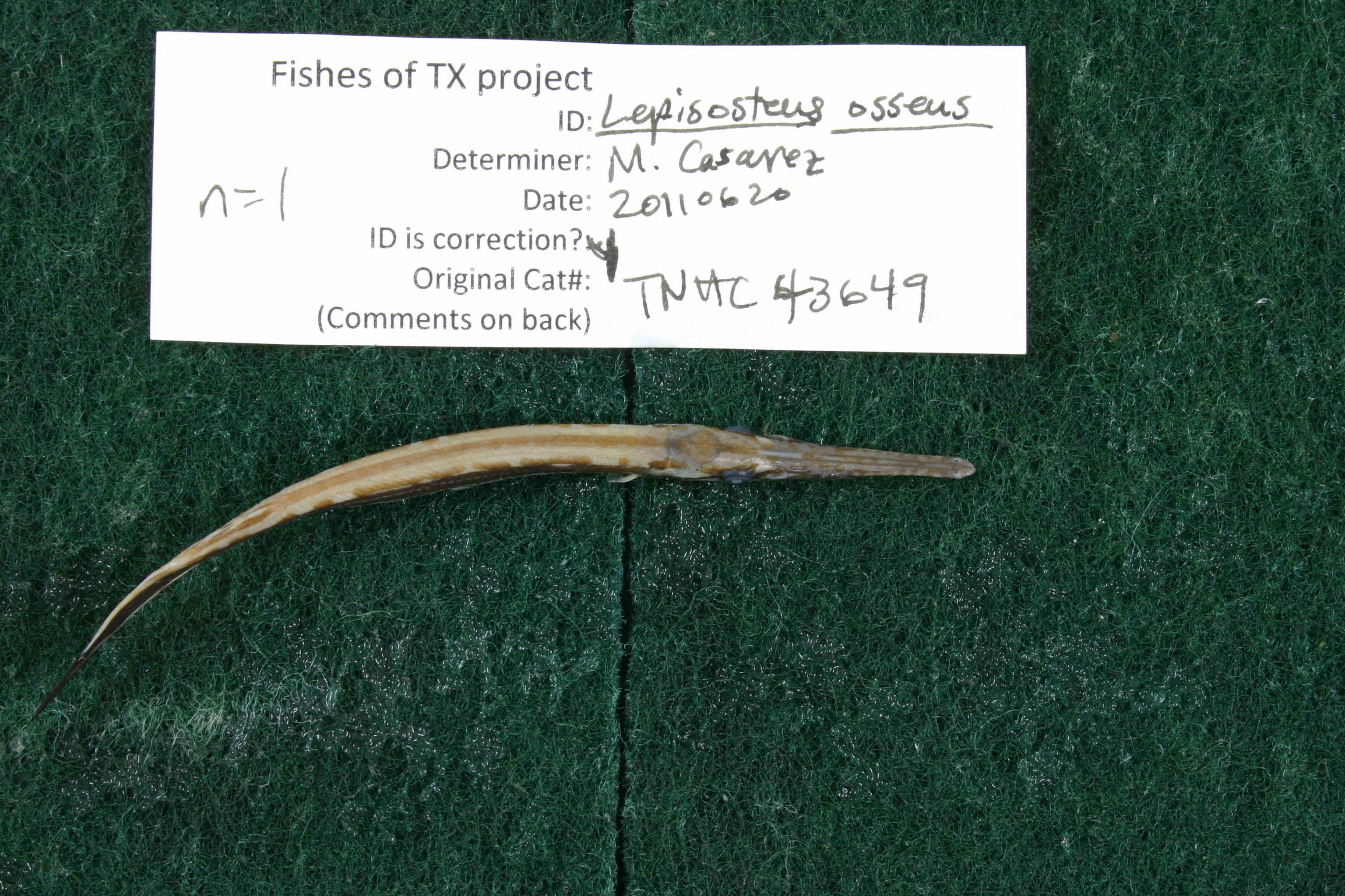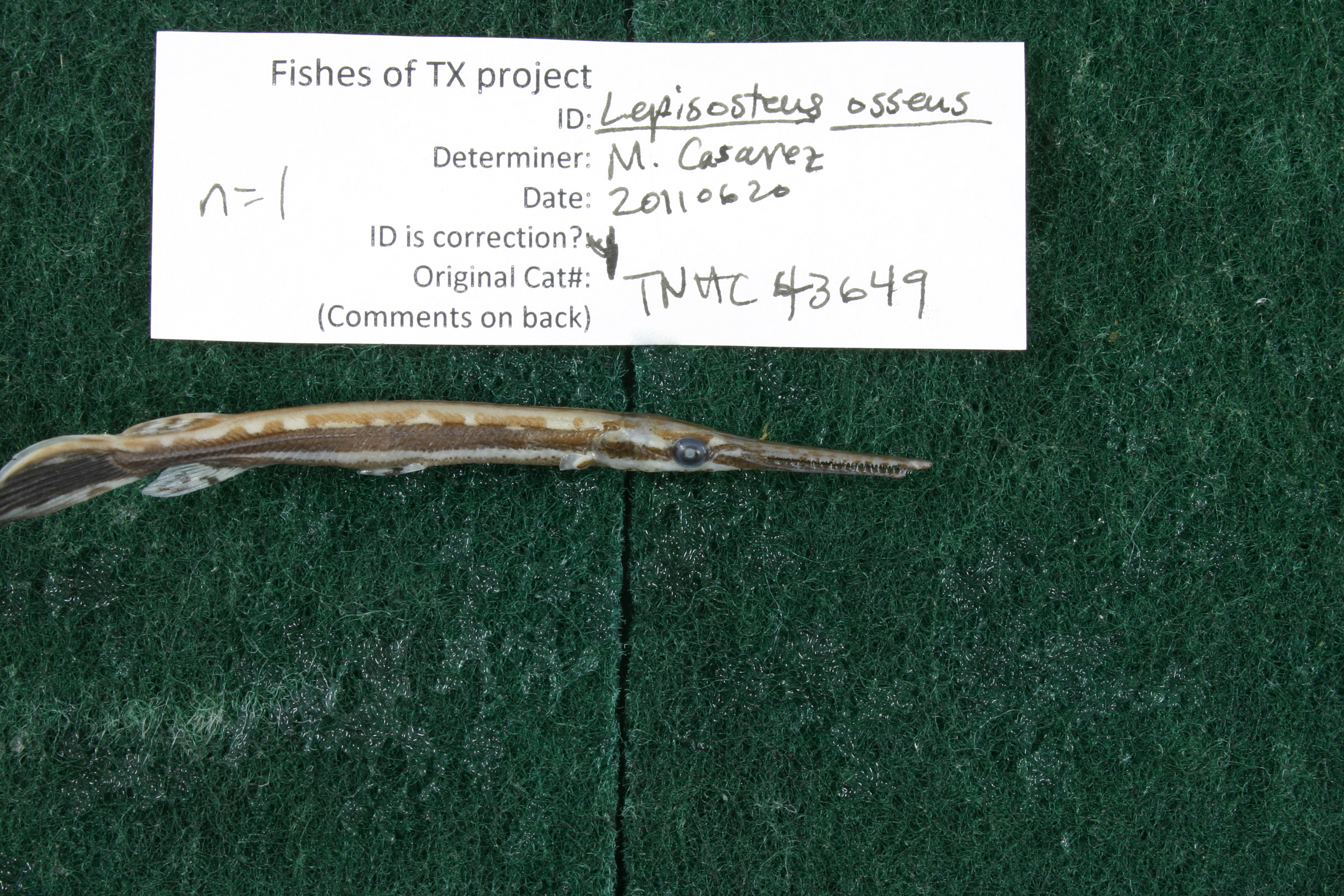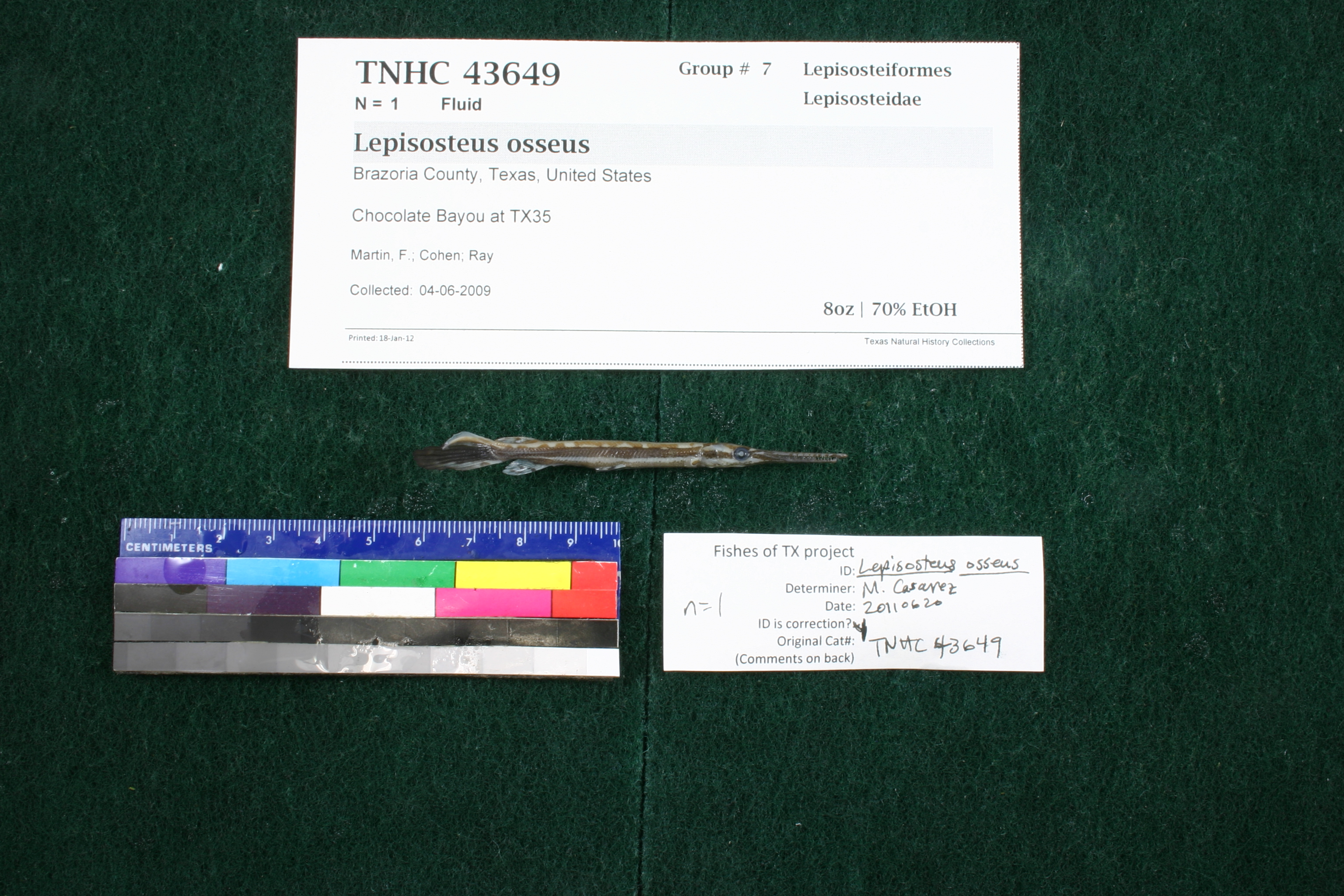 Specimen examined and Id'ed for FoTX project. | ID notes: lateral line scales: 60-62; *note for SL measurements that gar have heterocercal tails - all length measurements are based on SL and are approximate; MinSL(mm): 70.85; MaxSL(mm): ; Jar: 8 oz; Specimen condition: good; Mutations: none; Count Male: ; Count female: ; Extern parasites: n