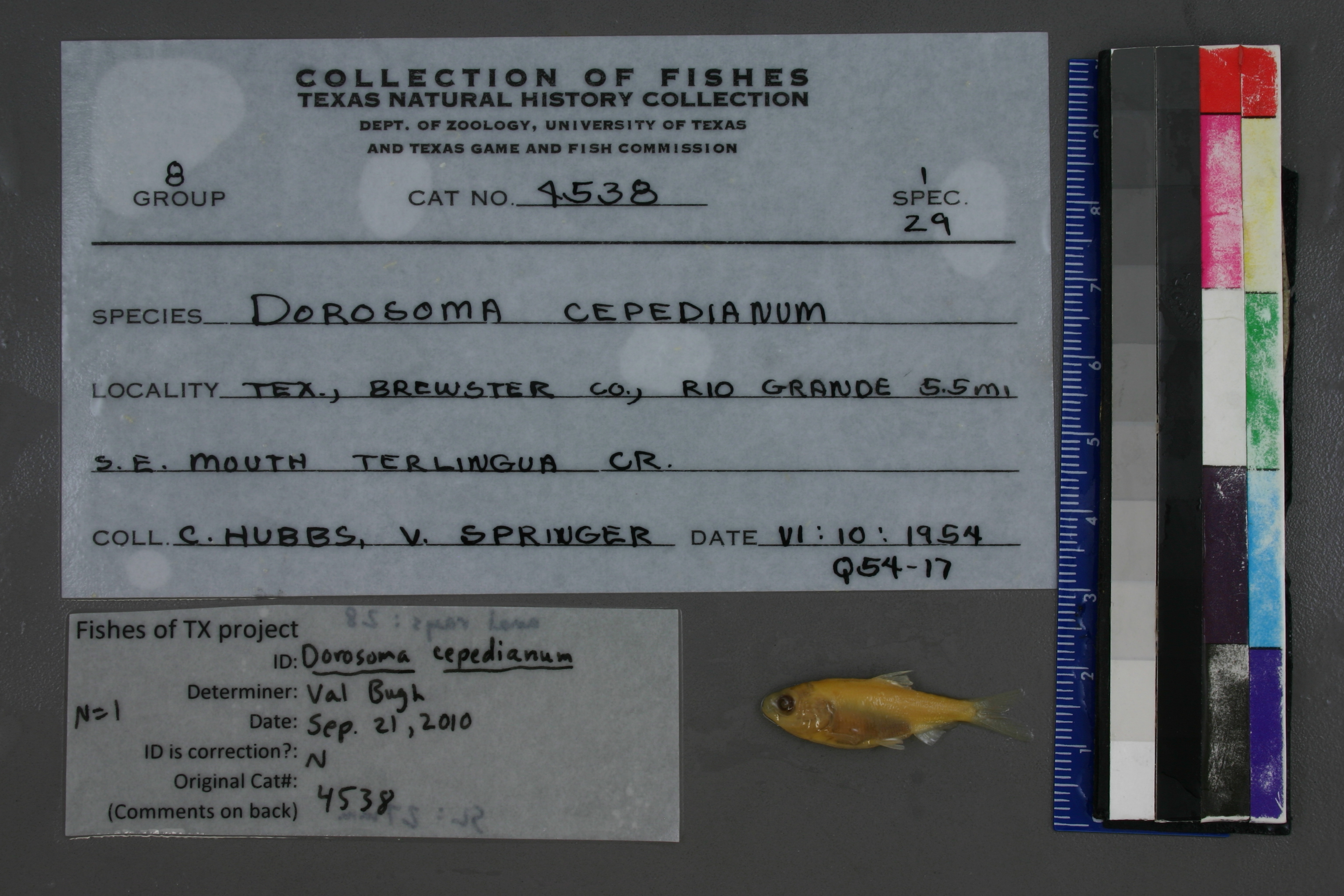 Specimen examined and Id'ed for FoTX project. | ID notes: anal rays: 28; MinSL(mm): 27; MaxSL(mm): ; Jar: 8 oz; Specimen condition: good; Mutations: none; Count Male: ; Count female: ; Extern parasites: