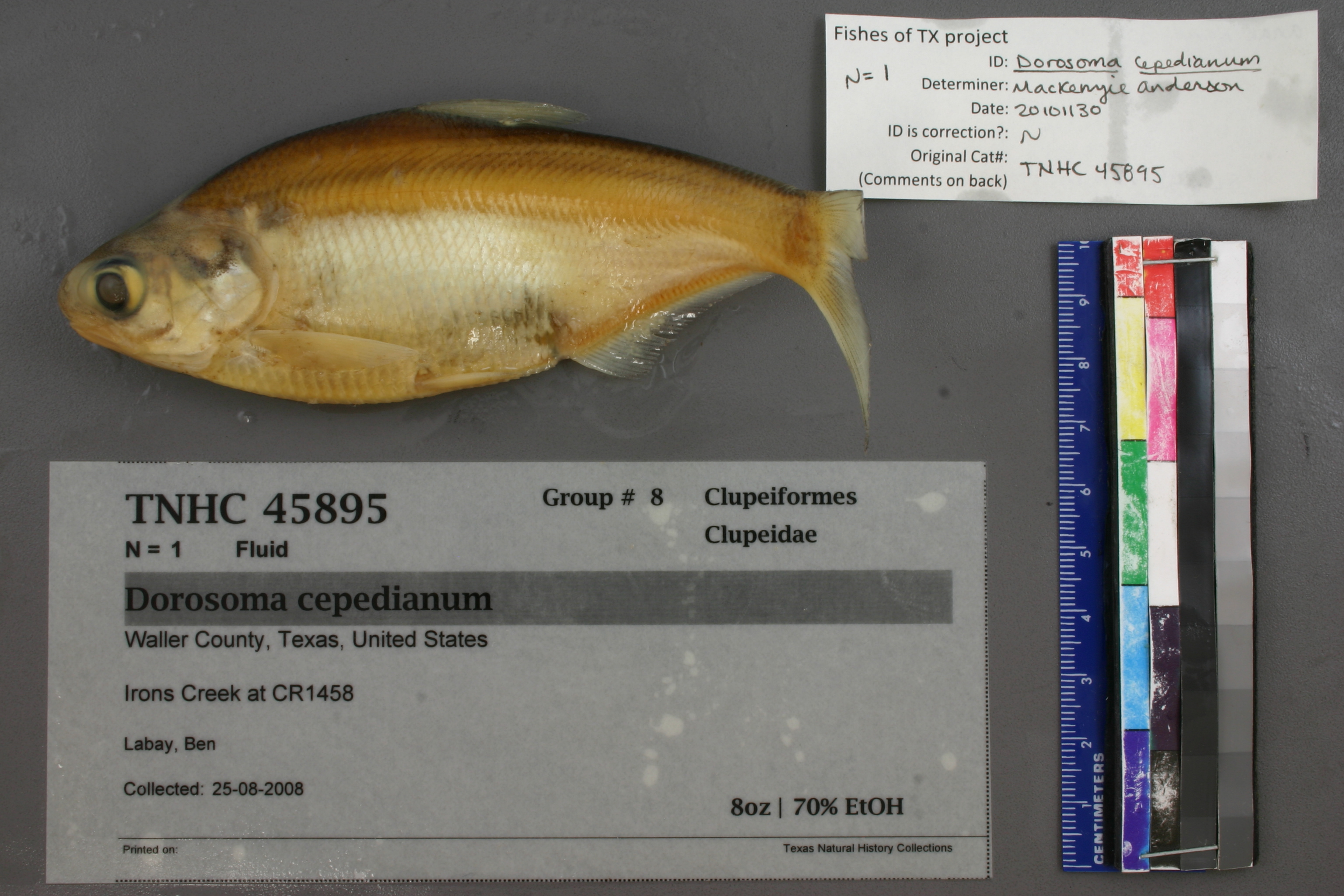Specimen examined and Id'ed for FoTX project. | ID notes: anal rays: 33; MinSL(mm): 118.46; MaxSL(mm): ; Jar: 8 oz; Specimen condition: good; Mutations: none; Count Male: ; Count female: ; Extern parasites: