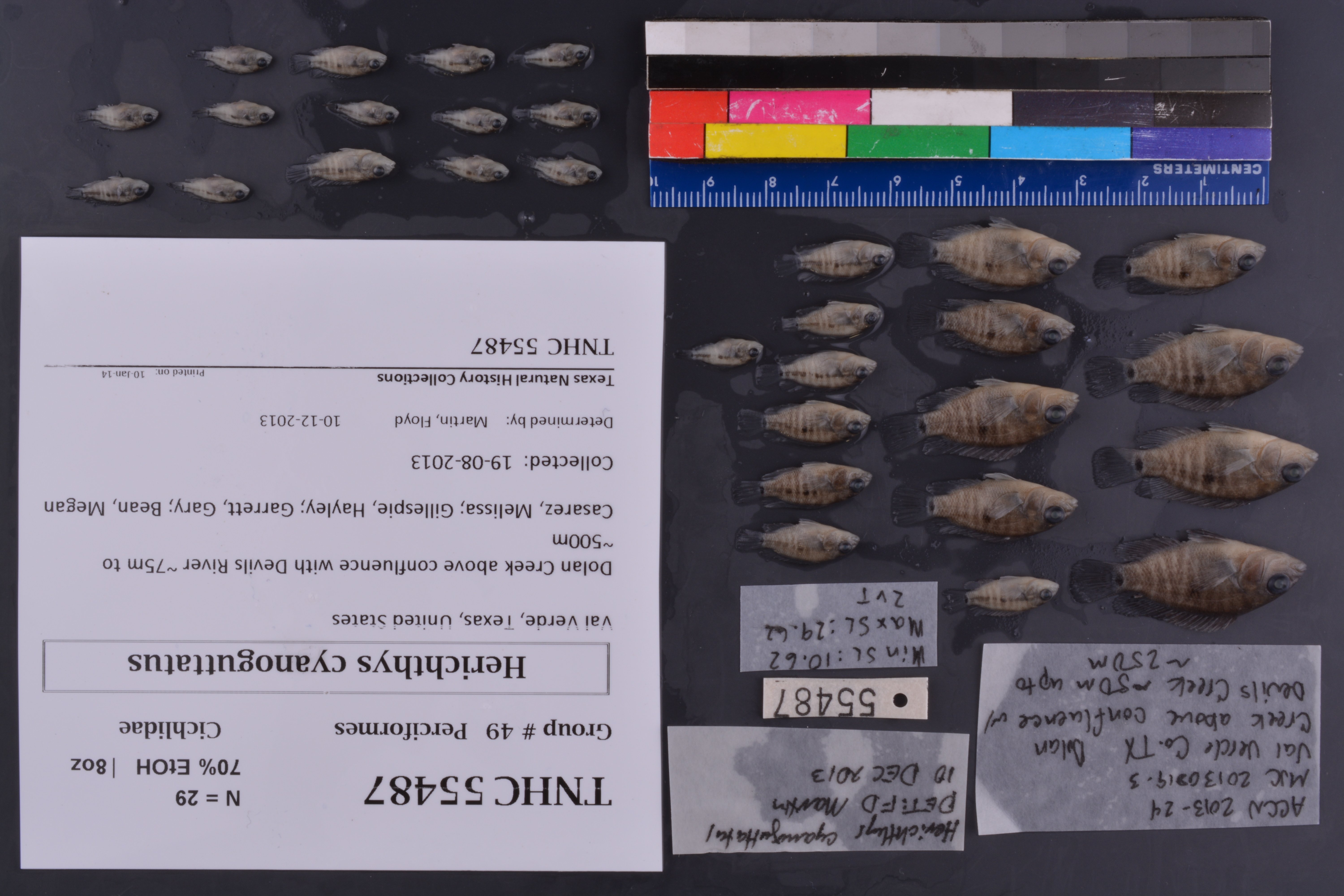 Event Remarksfield notes and photos available on server; jar labels say '~50m up to ~250m' but changed to ~75m up to ~500 after looking at site on topo maps; TPWD staff (Tom Heger) and interns conducted SVAP surveys alongside fish collections; lots were originally split into 4 separate mesohabitats per TPWD data collection process and later merged, after identifications by mesohabitat were recorded and provided to Gary Garrett and Megan Bean