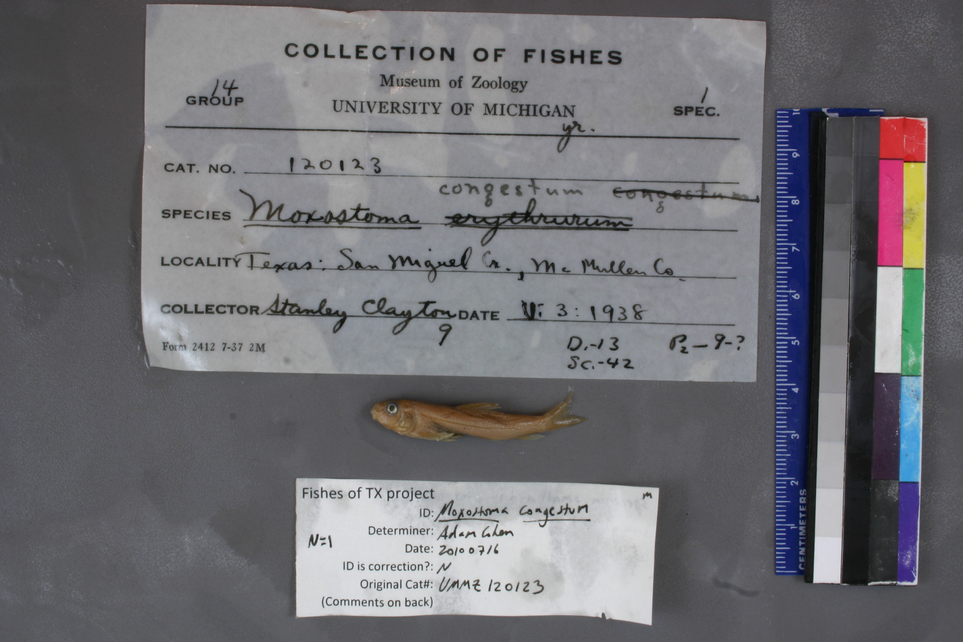 ID Comments: specimen small and in poor condition; most scales rubbed off but, lateral line present;ID is also confirmed from e-mail and Acces database of character measurements provided by Bob Jenkins (Feb 5,2010); From his database he assigns a high level of confidence in his ID; 'Of course, even now, we donât have all Mex-Tex Moxostoma taxa described or sufficiently known taxonomically and geographically, thus reluctance to attach names to some lots, perhaps most notably those from the RG/B'