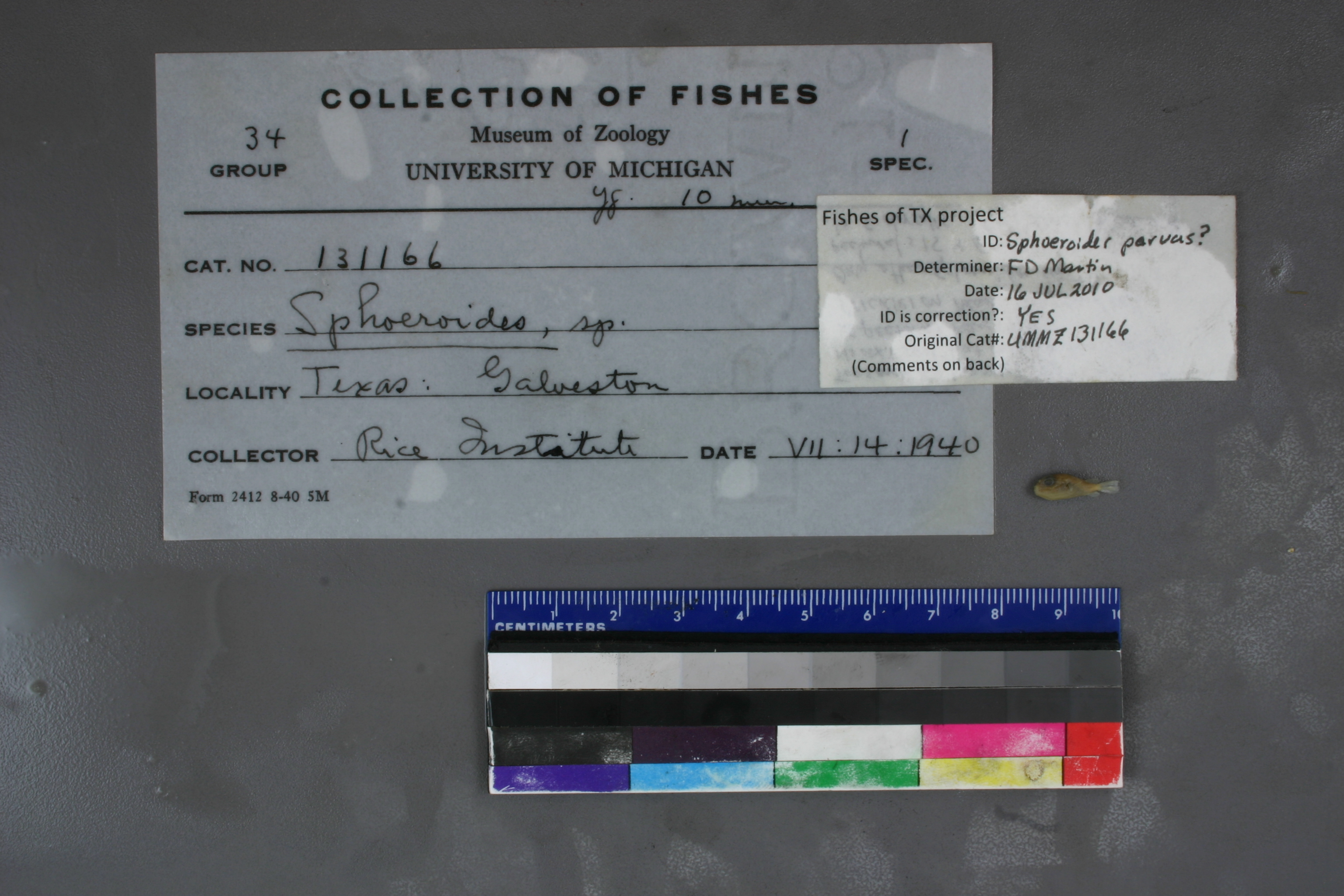 ID Comments: too small for lapets; no axil spot, but may be too small; 15 pectoral rays; prickles on head, body, and belly; only other Spheroides in TX with pectorals of 15 and prickles on whole body is S. dorsalis.