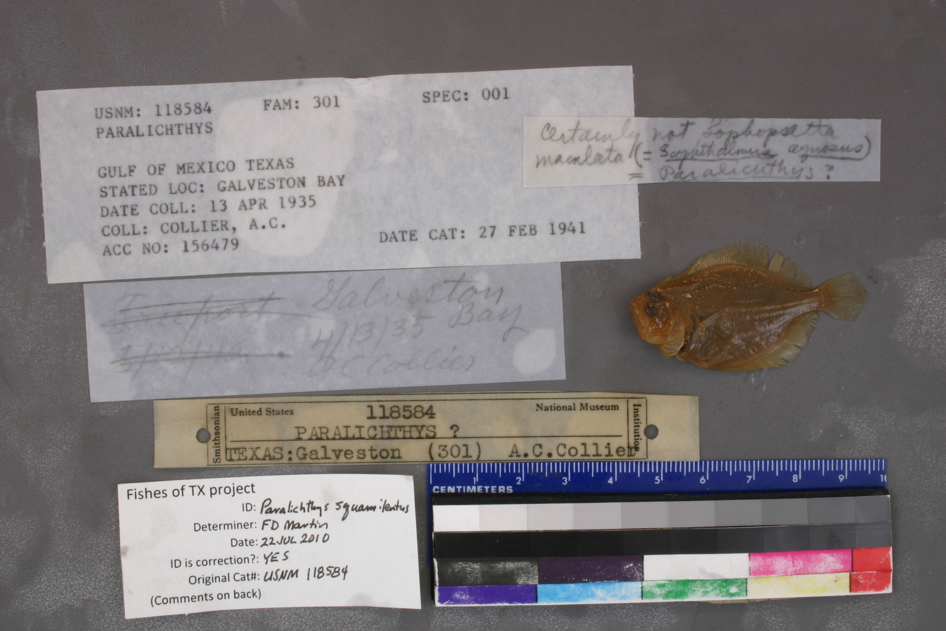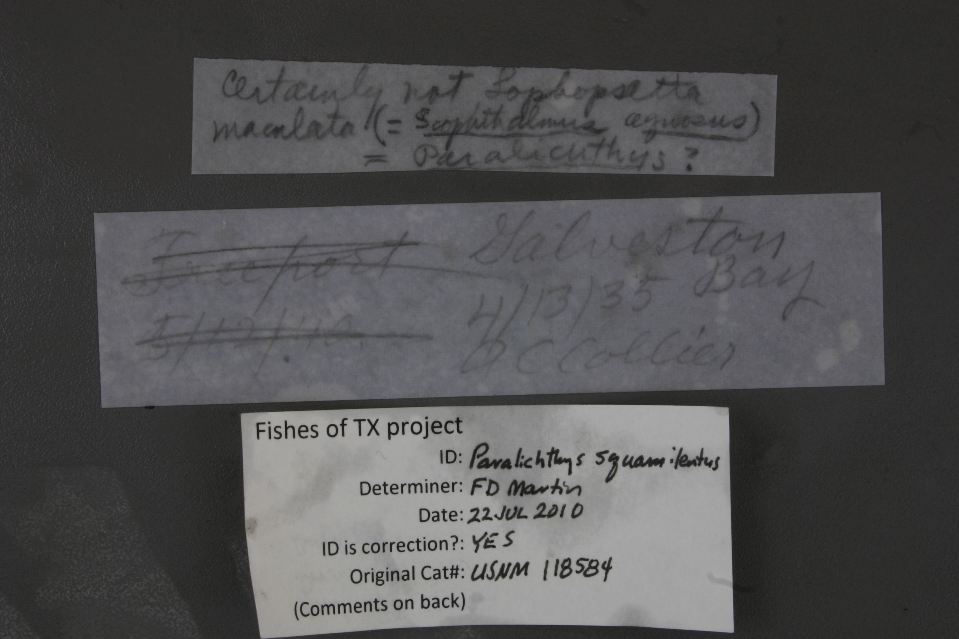 ID Status: Specimen examined and ID'ed for FoTX projectID Comments: Anal rays 61 or 62. Dorsal rays 78. Body depth to SL = 47.3%Georef Remark: Includes East Bay and West BayID Confidence: high