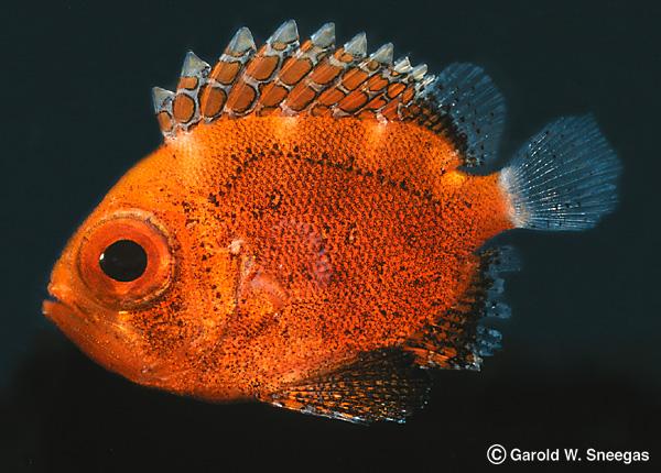 Color is dark red in life and pink to orange after preservation, with margins of rayed sections of dorsal and anal fins and caudal fin black. Pelagic juveniles are silvery gray, with spinous section of dorsal fin black.