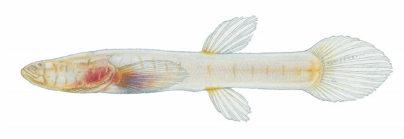 Body shape: elongated. Pink-white. No eyes (vestigial eye tissues under skin). Large, broad head. Caudal fin with 0-2 rows of papillae (Ref. 5723) and a vertical basal row (Ref. 10294); 10-15 branched caudal rays (Ref. 5723).
